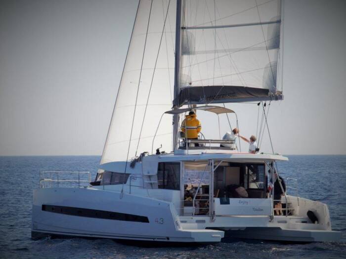 Katamaran Bali 4.3 Linda, innebygd 2017 ligger i Port de Bandol, Provence-Alpes-Côte d'Azur, Frankrike. Det har 4 + 2 hytter, imøtekomme 8 + 2 mennesker og har 4 toaletter. Sengetøy og kjøkkenutstyr er inkludert i prisen.