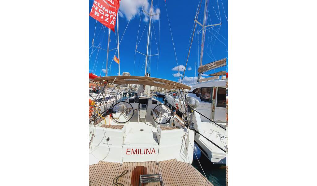 Segelyacht Sun Odyssey 389 Emilina, innebygd 2018 ligger i Ibiza, Club Nàutic Sant Antoni de Portmany, Baleariske øyer, Spania. Det har 3 hytter, imøtekomme 6 + 2 mennesker og har 1 toaletter. Sengetøy og kjøkkenutstyr er inkludert i prisen.